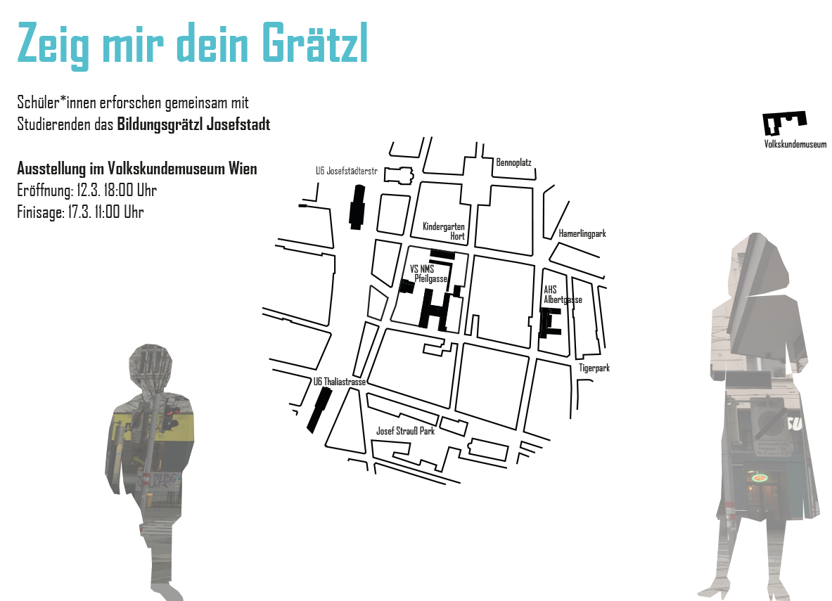 Im transdisziplinären Fokusseminar “Sozialer Raum und Diversität – Kindheit und Raum” erarbeiteten Studierende gemeinsam mit Korinna Lindinger (Forschungsbereich Soziologie, TU Wien) partizipative Methoden der Raumforschung und altersgruppengerechte dialogische Forschungsstrategien. Die Ausstellung “Zeig mir dein Grätzl” im Wiener Volkskundemuseum präsentiert von 12. – 17. März 2019 die Ergebnisse dieser Auseinandersetzung – Schüler*innenperspektiven auf das Bildungsgrätzl Josefstadt als Praxisbeispiel für spielerische und mehrsprachige Wissenschaftskommunikation.